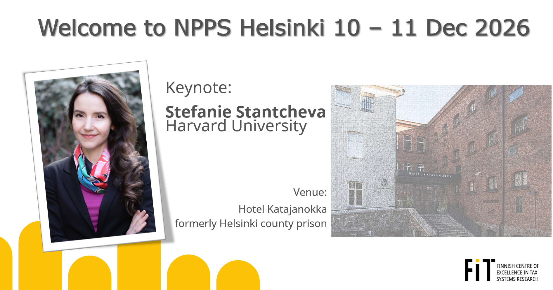 12. – 14.6.2024 Trans-Atlantic Public Economics Seminar (TAPES) -kutsuseminaari Helsingissä, järjestäjinä Verotutkimuksen huippuyksikkö, National Bureau of Economic Research (NBER) ja VATT. Lue lisää seminaarista (englanniksi) ja myös kesän muista tapahtumista laajemmin (suomeksi).